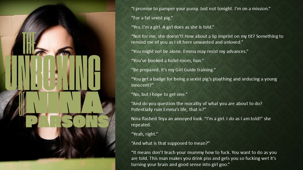 Categories Nina Parsons Your Saturday Sizzle! Nina gets ready for a night out – Story Excerpt Post author By Jake Mantlin Post date July 12, 2025 It’s your Saturday Sizzle as Teya questions Nina’s obsession with Trevor Perkins! Full novel on Smashwords – Get 50% off at Checkout using the Code SSW50! Click link for details. The Unboxing of Nina Parsons Cheers Jake The Book Guy Tags authortarian, betrayal, erotica, lesbian, obsession, workplace sex ← Freaky Friday Erotica – The Lore → More Saturday Sizzle!